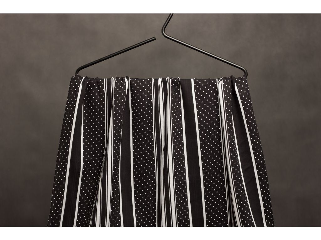 Viskóza z přírodních vláken nabízí hedvábně jemný omak, výraznou splývavost a příjemnou prodyšnost. Látka krásně padá na těle. Vrstvený vzor proužků a puntíků na černé je diskrétně výrazný.